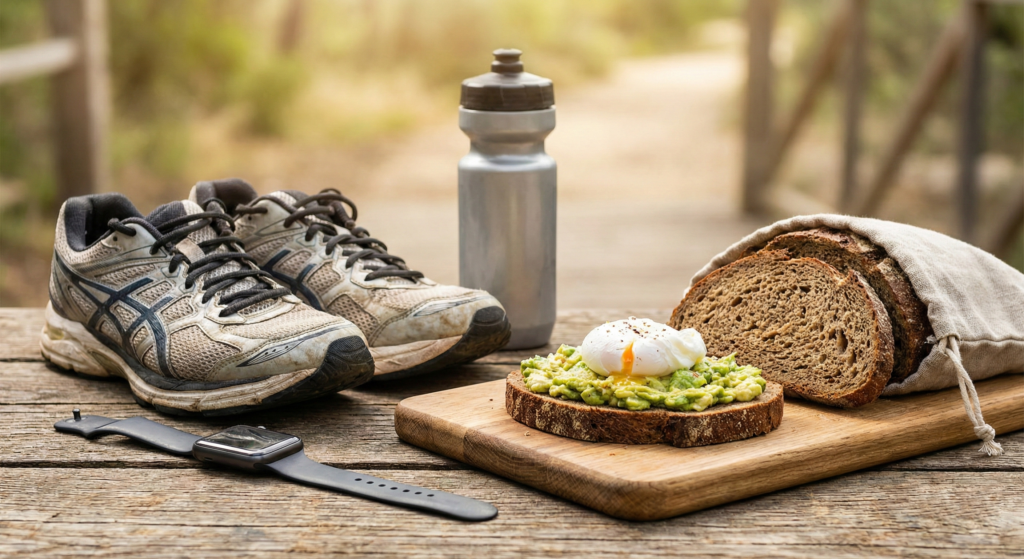 Zdrowe śniadanie dla aktywnych: tost z awokado na chlebie rzemieślniczym i buty do biegania.
